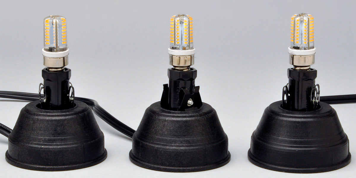 Each Kit include 3 each of: black base with notch cut in for cord, cords with easy on/off toggle switch, and custom made mini LED bulb (regular bulbs will heat up too much and pose a fire hazard with gourds).